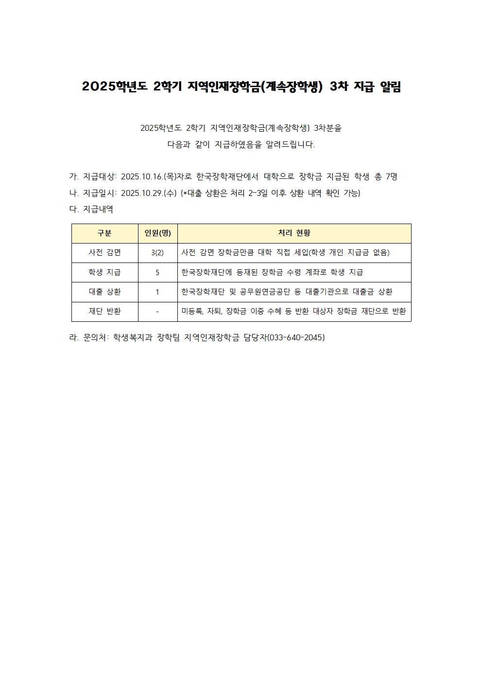 2025학년도 2학기 지역인재장학금(계속장학생) 3차 지급 알림