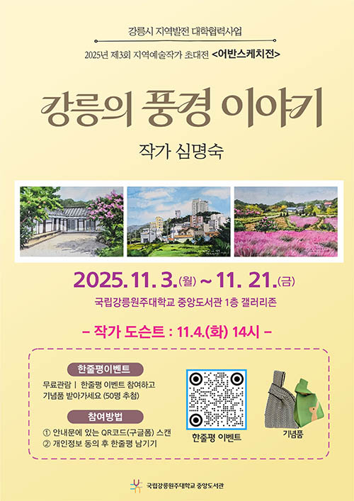 이번 전시는 심명숙 작가의 「강릉의 풍경이야기」를 주제로, 작가가 펜 드로잉과 스채화로 담아낸 강릉의 자연과 도시, 일상 속 풍경을 선보인다. 캔트지 위에 표현된 작품들은 강릉 곳곳에 숨겨진 아름다움을 섬세한 필치로 담아내어, 관람객에게 익숙한 공간 속 새로운 감동을 전할 예정이다.